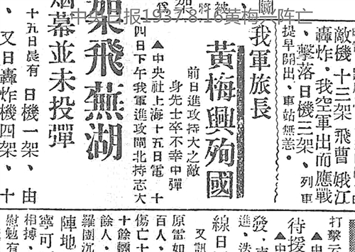 1937年8月,战事爆发后,全国各大报纸如《中央日报》《大公报》《中山日报》等,都根据中央社的统一电讯,报道了黄梅兴将军在“闸北持志大学”阵亡的消息。其中,广州的《中山日报》更是连续两天大篇幅报道,因为黄将军是广东平远人,家乡的媒体自然格外关注。