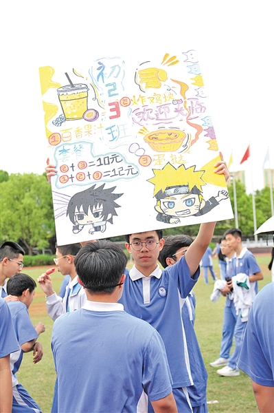 漫步摊位区,各地风味与校园创意碰撞出奇妙火花。初一学子带来清爽寿司、酸甜果茶、嫩滑凉粉,用简单食材打造舌尖清凉;初二班级主打奶茶、凉拌菜、钵钵鸡等,鲜香浓郁,人气爆棚;高中部摊位更是亮点纷呈,炸鸭爪、烧烤、仙人粄、杨枝甘露等特色美食一应俱全,既有客家传统风味,又有网红潮流小吃。每个摊位前都围满了师生,叫卖声、欢笑声此起彼伏,热闹的烟火气与青春活力,填满了整个运动场。