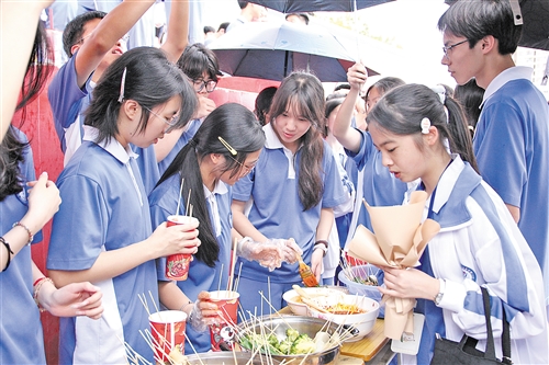高二(1)班摊位主打钵钵鸡,荤素搭配近30种食材,色泽诱人、香气扑鼻,成为现场热门摊位之一。该班学生曾惠在采访中分享:“我们班材料费大约花了 500 元,从采购食材到清洗、串制、调味,前后准备了三四天,全班同学分工合作,虽然辛苦,但特别开心。活动所得收入将全部归入班费,这次活动既锻炼了我们的动手能力,也让我们懂得珍惜与规划。”质朴的话语,道出梅雁中学美食节最本真的意义——在劳动中实践,在合作中成长,在创造中收获。