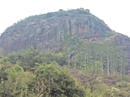 曾几何时,在往返于梅州和广州之间途经河源源城区的高速公路上,总能看见一个规模不小的丹霞岩峰,心里早有前去探究的愿望。经查黄进教授的《中国丹霞地貌简表》,这座仰慕已久的丹霞岩峰称“密石寨”,面积有0.6平方公里,岩层时代属第三纪。抖音上多称此山为“望郎回”和“馒头山”;除此之外,尚有“美石寨”或“尾石寨”等见诸相关文献。初春的一天,带着满满的期待,我们出发了。