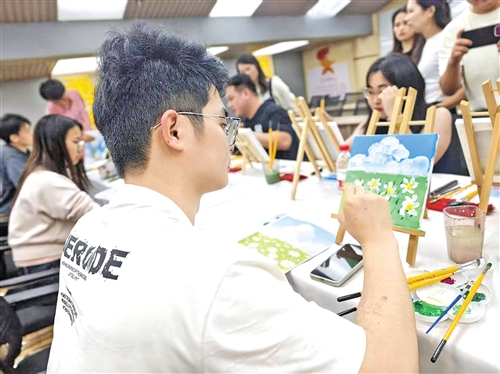 活动现场氛围温馨而热烈,舒缓的轻音乐萦绕全场,青年们褪去浮躁,全身心沉浸在油画创作之中。大家手持画笔,在画布上肆意挥洒色彩,从小心翼翼地勾勒轮廓,到精心调配颜料填充画面,彼此相互交流、分享创作灵感,时而低头专注作画,时而轻声探讨技巧,原本空白的画布,渐渐被斑斓的色彩填满,一幅幅充满青春气息与个人巧思的油画作品逐渐成形。