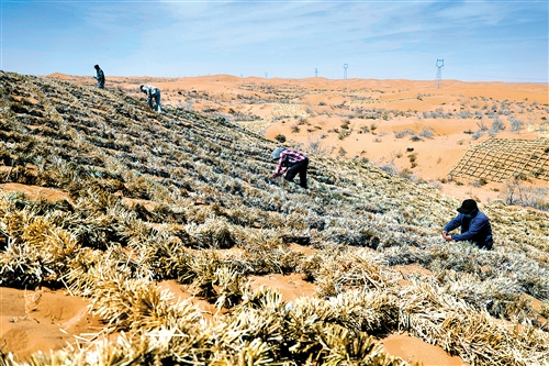 近日,宁夏中卫市组织治沙工人开展春季宁夏境内腾格里沙漠固沙锁边带改造提升工作,铺设新式草方格沙障,不断巩固治沙成果,筑牢黄河上游生态屏障。