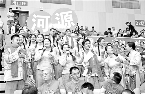 “山连山来水连水,梅州河源心相牵,篮球牵线结知己,情谊长存万万年。”河源拉拉队也不甘示弱,豪迈也动人。