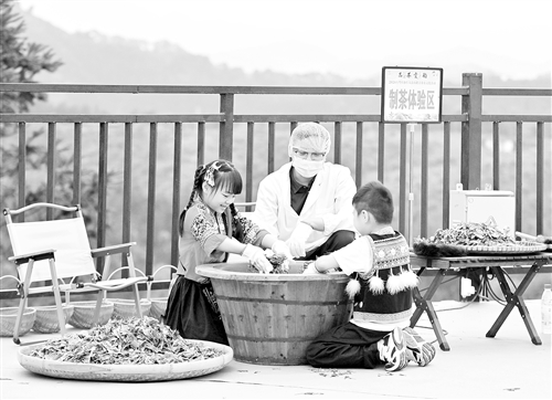 4月12日,广西柳州市融水苗族自治县举办粤桂协作大苗山踏青茶旅文化活动,茶商和游客欢聚苗乡,赏春色、品春茶、话产业发展。在广西融水苗族自治县水融香粤桂协作现代农业产业园,小朋友在茶山上体验制茶。 (新华社发)