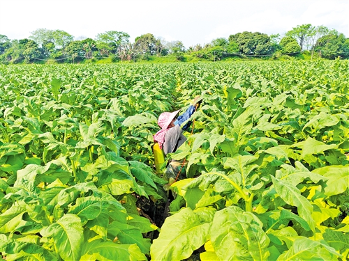 本报讯 4月11日,五华县安流镇五联村百亩烟地里,烟农踮起脚尖,在一行行高过人头的烟苗里打顶、摘烟耳,喷洒抑芽剂(如上图)。