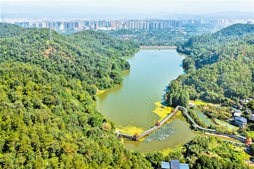 走进清凉山郊野公园,满目青翠沁人心脾。自然教育径蜿蜒林间,客家文化长廊雅致舒展,不少市民漫步其中,尽享生态之美。公园内,“文化林”“人大代表林”整齐排列、生机勃发,这是梅江区动员社会力量共建绿美家园的生动缩影。近年来,梅江区深入推进绿美梅江生态建设,清凉山郊野公园秉持“以绿为体,以水为魂,山水相依”理念,打造“一山(森林山体)一水(泮坑水库)一径(林间步道)”,通过低质低效林优化提升、松材线虫病染疫松林改造提升、森林抚育等措施,种植红锥、楠木、山樱花等乡土阔叶树种,搭配桃金娘、油茶等灌木,持续提升森林质量,实现绿上添花、花果飘香。