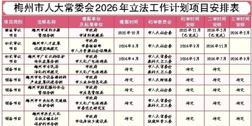 梅州市人大常委会2026年立法工作,坚持以习近平新时代中国特色社会主义思想为指导,全面贯彻落实党的二十大和二十届历次全会精神,深入学习贯彻习近平总书记视察广东、视察梅州重要讲话重要指示精神,围绕我市“十五五”规划和市委工作部署,把握改革与法治的关系,立足市情,深化改革,突出特色,做好新时代地方立法工作,推动梅州苏区加快振兴、共同富裕。