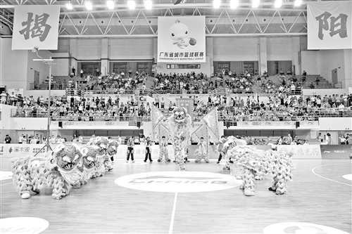 赛场内,两队激烈交锋。中场休息期间,两队互赠特色礼品,增进两地情谊。梅州队送出的是蕉岭寿乡优品大礼包,包含果蔬汁、盐焗食品、酒、矿泉水、丝苗米、梅菜扣肉、蜂蜜柠檬水、绿茶等本土特色产品。揭阳队则赠予文创定制折扇与惠来虾枣礼盒,彰显地方文脉与产业实力。此外,孙淑强青狮队带来青狮展演。8头青狮气势如虹、腾跃翻飞,将潮汕非遗的魅力展现得淋漓尽致,让观众沉浸式领略传统文化风采。