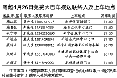 据悉,4月26日当天,粤超专属球迷大巴将在梅江区、梅县区、兴宁市、平远县、蕉岭县、大埔县以及丰顺县的相关地点等候,球迷可到相关地点统一乘车前往比赛地点五华奥体中心惠堂体育场。比赛结束后,球迷统一乘车返回。需要注意的是,此项服务免费,只面向已购买该场次观赛球票的球迷,球迷凭球票乘车。需要乘车的球迷扫乘车码登记或电话联系(官方购票小程序和乘车码见下方广告),按发车时间准时登车。