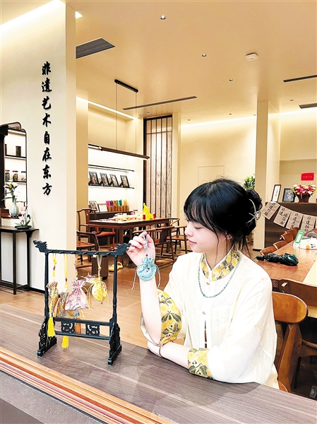 同时,场馆深挖非遗文创价值,将传统技艺与现代审美、生活需求相结合,打造各类实用型非遗周边产品,让非遗从“观赏品”变成日常可用的“生活用品”,进一步拉近人们与非遗的距离。“我们主打‘实用型’体验,像竹编扇、拓印画、中药香囊、扎染发圈等都是生活中的常见用品,希望人们在体验中了解非遗,制作的作品也真正能用于生活,而非束之高阁。”廖佳乐说。